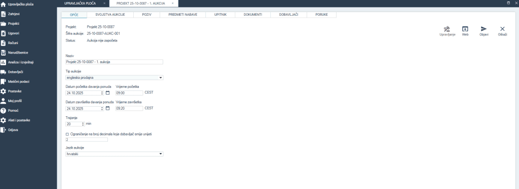 - Ključni parametri su početna cijena predmeta prodaje i vrijeme trajanja nadmetanja.