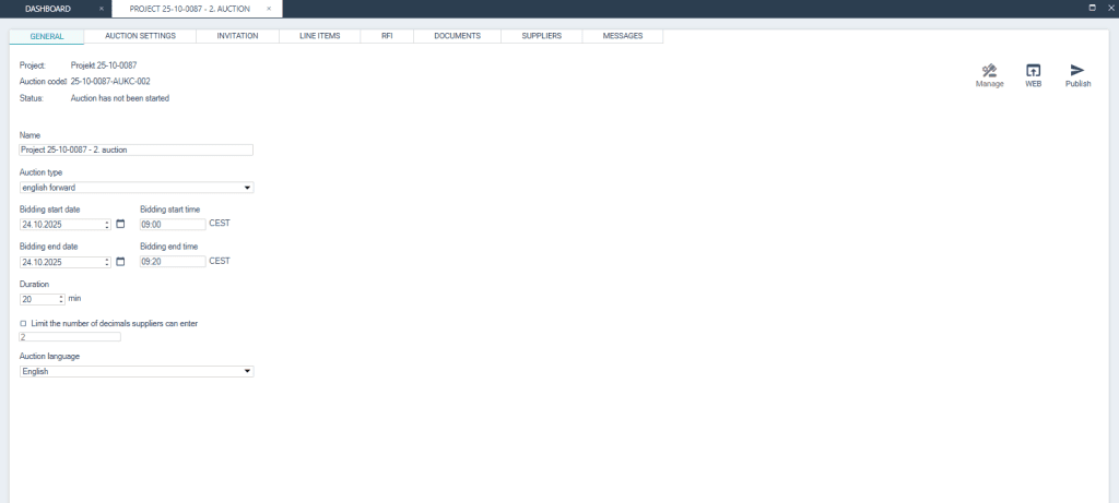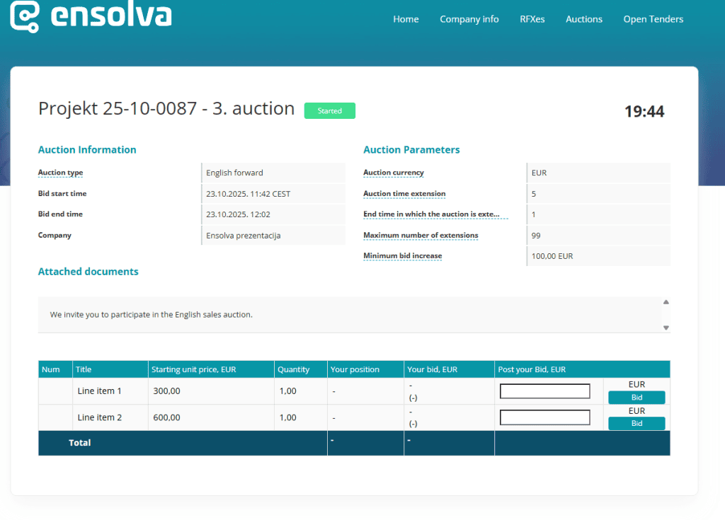 Ensolva sales e-auctions enable a simple and transparent sale of stocks, real estate, services, receivables and assets. Sales e-auctions have found their application in all companies, regardless of their activity and size. They are often used in B2B negotiations to achieve a better price. On the other hand, they provide all participants with an equal opportunity to participate.